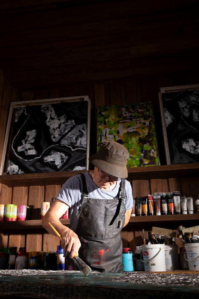 Nhà nghiên cứu Phước Châu lại tiếp cận ở góc nhìn triết luận hơn. Theo ông, “được-là-chính-mình” với nghệ sĩ không phải lúc nào cũng được định danh rõ ràng bởi công chúng. Đó là hành trình đối diện bản ngã, nơi thành công và thất bại luôn đồng hiện. Trong loạt tác phẩm mới, cuộc chơi chất liệu của Đinh Phong thể hiện rõ dấu ấn, nhưng cuộc chơi sắc màu còn nhiều băn khoăn. “Chính trạng thái thành – bại ấy mới là điểm kích hoạt mạnh mẽ đối với người nghệ sĩ, khi họ kéo hình thể đời sống bước vào hình thể tự luận đầy khúc mắc của kẻ tạo tác.”- Ông Châu nói.